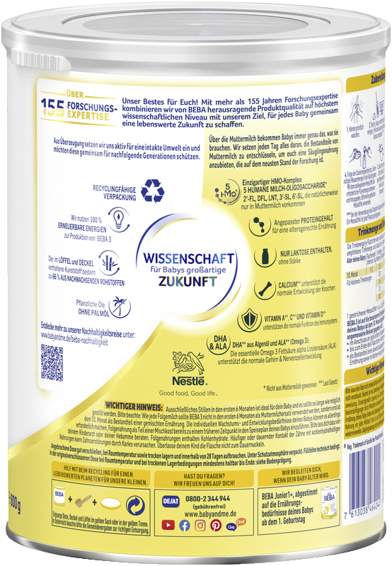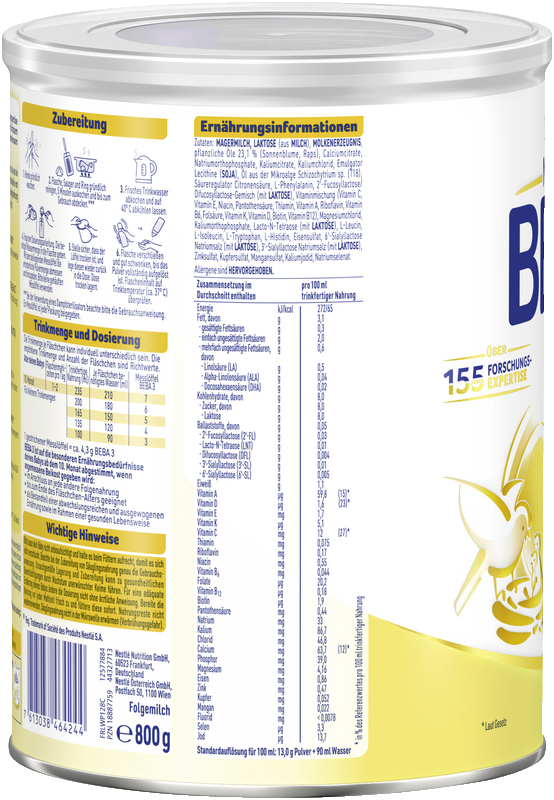 MAGERMILCH, LAKTOSE (aus Milch), MOLKENERZEUGNIS, pflanzliche Öle 23,1% (Sonnenblume, Raps), Calciumcitrate, Natriumorthophosphate, Kaliumcitrate, Kaliumchlorid, Emulgator Lecithine (SOJA), Öl aus der Mikroalge Schizochytrium sp. (T18), Säureregulator Citronensäure, L-Phenylalanin, 2´-,Fucosyllactose/ Difucosyllactose-Gemisch (mit LAKTOSE), Vitaminmischung (Vitamin C, Vitamin E, Niacin, Pantothensäure, Thiamin, Vitamin A, Riboflavin, Vitamin B6, Folsäure, Vitamin K, Vitamin D, Biotin, Vitamin B12), Magnesiumchlorid, Kaliumorthophosphate, Lacto-N-Tetraose (mit LAKTOSE), L-Leucin, L-Isoleucin, L-Tryptophan, L-Histidin, Eisensulfat, 6'-Sialyllactose Natriumsalz (mit LAKTOSE), 3'-Sialyllactose Natriumsalz (mit LAKTOSE), Zinksulfat, Kupfersulfat, Mangansulfat, Kaliumjodid, Natriumselenat.