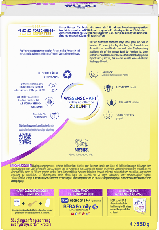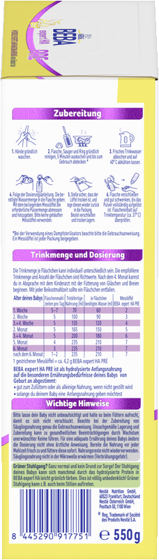 Wichtiger Hinweis: Stillen ist die beste Ernährung für ein Baby. Säuglingsnahrung sollte nur auf Rat unabhängiger Fachleute verwendet werden. BEBA EXPERT HA PRE ist geeignet für die besondere Ernährung von Säuglingen während der ersten Lebensmonate, wenn nicht gestillt wird.