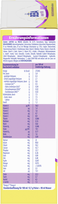 LAKTOSE (aus MILCH), pflanzliche Öle 24,7% (Sonnenblume, Raps), hydrolysiertes MOLKENEIWEIß, Kaliumorthophosphate, Calciumcitrate, Cholinbitartrat, Kaliumchlorid, Magnesiumchlorid, Öl aus Mortierella alpina, Öl aus der Mikroalge Schizochytrium sp. (T18), L-Arginin, Natriumchlorid, Vitaminmischung (Vitamin C, Pantothensäure, Niacin, Vitamin E, Riboflavin, Thiamin, Vitamin A, Vitamin B6, Folsäure, Vitamin K, Biotin, Vitamin D, Vitamin B12), L-Histidin, L-Phenylalanin,Milchsäurebakterien (L. reuteri)*, Inositol, Taurin, Eisensulfat, L-Carnitin, Zinksulfat, Nukleotide (Cytidin-5´-Monophosphat, Uridin-5'-Monophosphat, Adenosin-5'-Monophosphat, Guanosin-5'-Monophosphat), Kupfersulfat, Mangansulfat, Kaliumjodid, Natriumselenat.