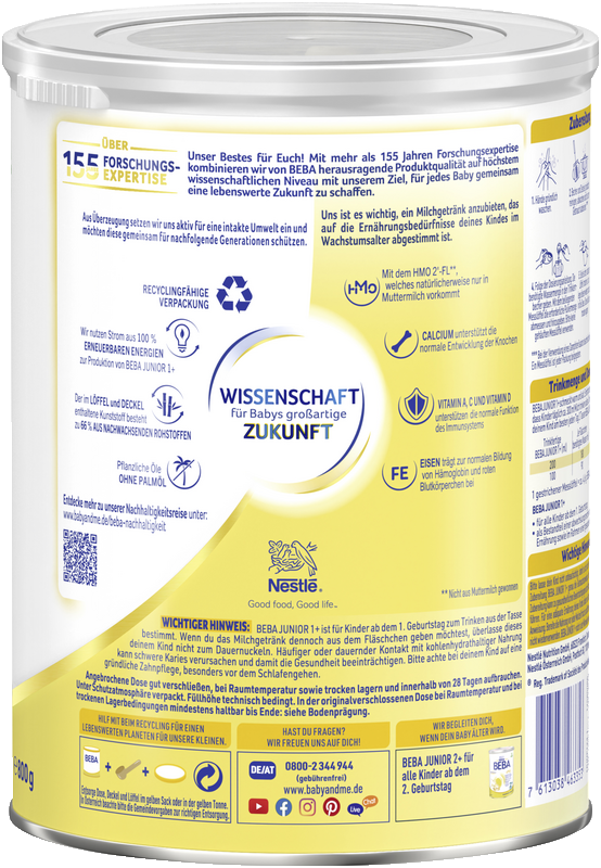 | Zu beachten: BEBA JUNIOR 1+ schmeckt warm und kalt. Ernährungsexperten empfehlen, dass Kinder täglich ca. 300 ml Milch trinken. | Basierend auf dieser Empfehlung empfehlen wir dir, deinem Kind am besten jeden Tag 2 Tassen BEBA JUNIOR 1+ zu geben. |