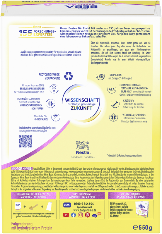 Ausschließliches Stillen in den ersten 6 Monaten ist ideal für dein Baby und es sollte solange wie möglich gestillte werden. Bitte beachte: Wie jede Folgenahrung sollte BEBA EXPERT HA 2 nicht in den ersten 6 Monaten als Muttermilchersatz verwendet werden, sondern erst nach dem 6. Monat als Bestandteil einer gemischten Ernährung. Die individuellen Wachstums- und Entwicklungsbedürfnisse deines Babys können es allerding erforderlich machen, Folgenahrung als Bestandteil einer Mischkost bereits zu einem früheren Zeitpunkt in den Speisplan deines Babys einzuführen. Bitte lass dich dazu von deinem Kinderarzt oder deiner Hebamme beraten. Folgenahrungen enthalten Kohlenhydrate. Häufiger oder dauernder Kontakt der Zähne mir kohlenhydrathaltigen Nahrungen kann Zahnzerstörungen durch Karies verursachen. Überlasse deinem Kind die Flasche nicht zum Dauernuckeln. Bei einer bestehenden Kuhmilch-Eiweiß-Allergie oder dem Verdacht auf eine solche darf BEBA EXPERT HA 2 nicht gegeben werden. Treten allergieverdächtige Symptome bei deinem Baby auf, solltest du deinen Kinderarzt hinzuziehen.
