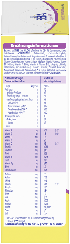 Zutaten: LAKTOSE (aus MILCH), pflanzliche Öle 21,7 % (Sonnenblume, Raps), hydrolysiertes MOLKENEIWEIß, Calciumglycerophosphat, Calciumorthophosphate, FISCHÖL, Kaliumchlorid, Calciumchlorid, Magnesiumchlorid, Öl aus Mortierella alpina , L-Arginin, Vitaminmischung (Vitamin C, Pantothensäure, Vitamin E, Niacin, Riboflavin, Thiamin, Vitamin A, Vitamin B6, Folsäure, Vitamin K, Biotin, Vitamin D, Vitamin B12), L-Histidin, Milchsäurebakterien (L. reuteri)*, L-Tyrosin, Natriumchlorid, Eisensulfat, Zinksulfat, Kupfersulfat, Mangansulfat, Kaliumjodid, Natriumselenat.
