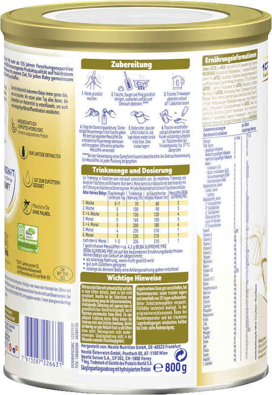 Eine unsachgemäße Zubereitung von Säuglingsnahrung, eine Verwendung von nicht als Säuglingsnahrung geeigneten Lebensmitteln oder eine unangemessene Ernährung kann zu gesundheitlichen Beeinträchtigungen führen. Bitte beachte deshalb sorgfältig die Hinweise und Zubereitungsanleitungen auf den Packungen.
