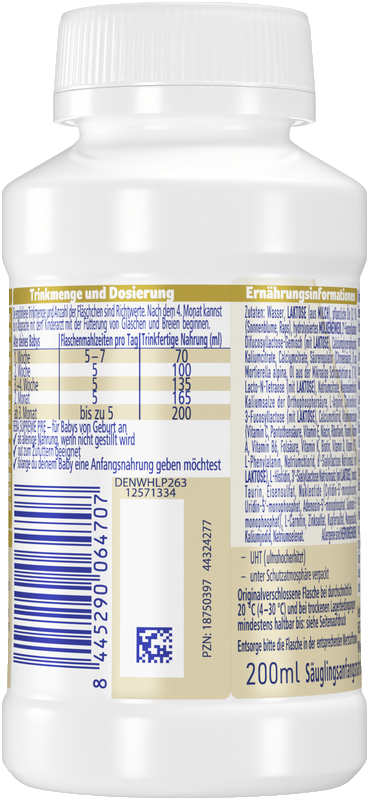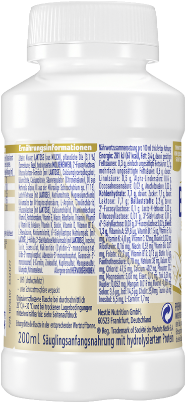Zutaten: Wasser, LAKTOSE (aus MILCH), pflanzliche Öle (3,1%) (Sonnenblume, Raps), hydrolysiertes MOLKENEIWEISS, 2‘-Fucosyllactose/Difucosyllactose-Gemisch (mit LAKTOSE), Calciumglycerophosphat, Kaliumcitrate, Calciumcitrate, Säureregulator (Citronensäure), Öl aus Mortierella alpina, Öl aus der Mikroalge Schizochytrium sp. (T18), Lacto-N-Tetraose (mit LAKTOSE), Natriumcitrate, Magnesiumchlorid, Kaliumsalze der Orthophosphorsäure, L-Arginin, Cholinchlorid, 3‘-Fucosyllactose (mit LAKTOSE), Calciumchlorid, Vitaminmischung (Vitamin C, Pantothensäure, Vitamin E, Niacin, Riboflavin, Thiamin, Vitamin A, Vitamin B6, Folsäure, Vitamin K, Biotin, Vitamin D, Vitamin B12), L-Phenylalanin, Natriumchlorid, 6'-Sialyllactose Natriumsalz (mit LAKTOSE), L-Histidin, 3'-Sialyllactose Natriumsalz (mit LAKTOSE), Inositol, Taurin, Eisensulfat, Nukleotide (Cytidin-5'-monophosphat, Uridin-5'-monophosphat, Adenosin-5’-monophosphat, Guanosin-5’-monophosphat), L-Carnitin, Zinksulfat, Kupfersulfat, Mangansulfat, Kaliumjodid, Natriumselenat.