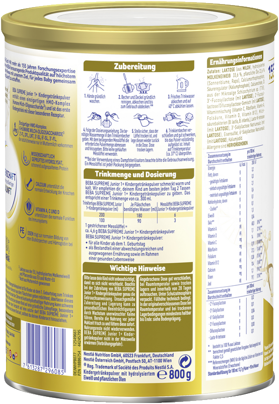 1 gestrichener Messlöffel = ca. 4,6 g BEBA SUPREME 1+ Kindergetränk